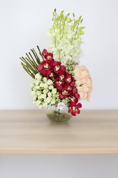 باقة ورد وردية راقية تجمع بين الأناقة والجمال، فيها ورد وردي، أوركيد، وأبيض، منظر مدهش بإناء زجاجي دائري يبرز جمالها، ألوان ساحرة تنبض بالأنوثة والهدوء والرقي.