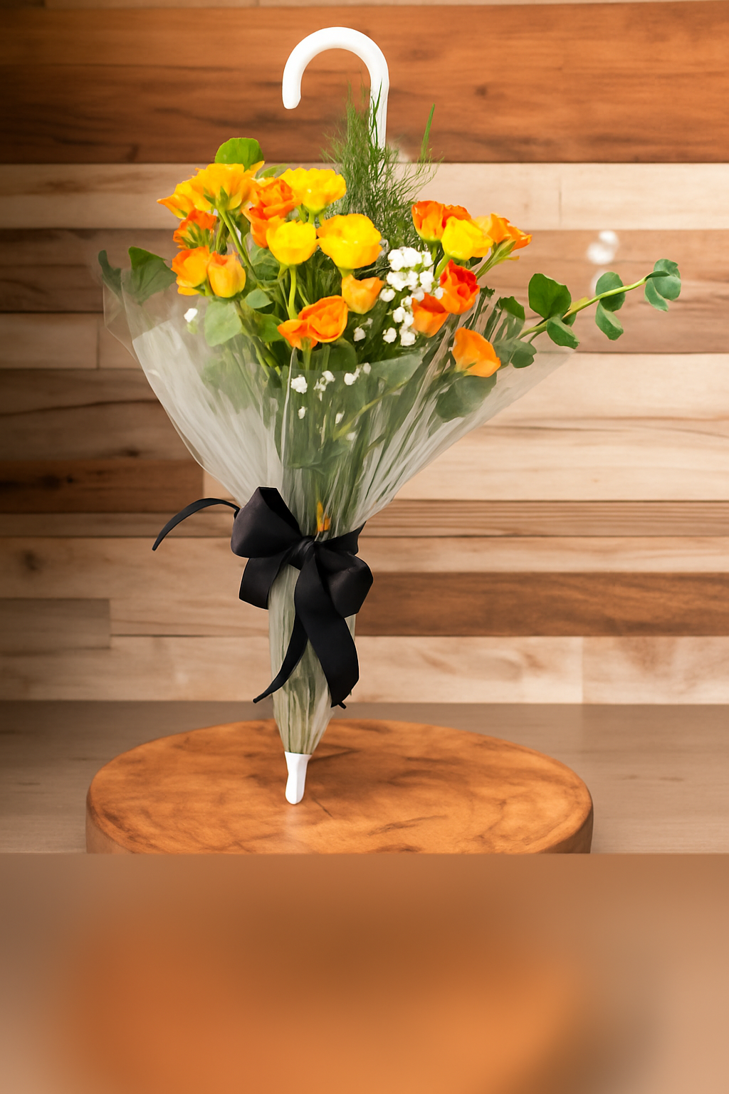 باقة مشرقة على شكل مظلة من الورود البرتقالية والصفراء مع لمسة من الجيبسوفيليا والخضرة، ملفوفة بأناقة ومرتبطة بشريط أسود، ترمز للبهجة والدفء.