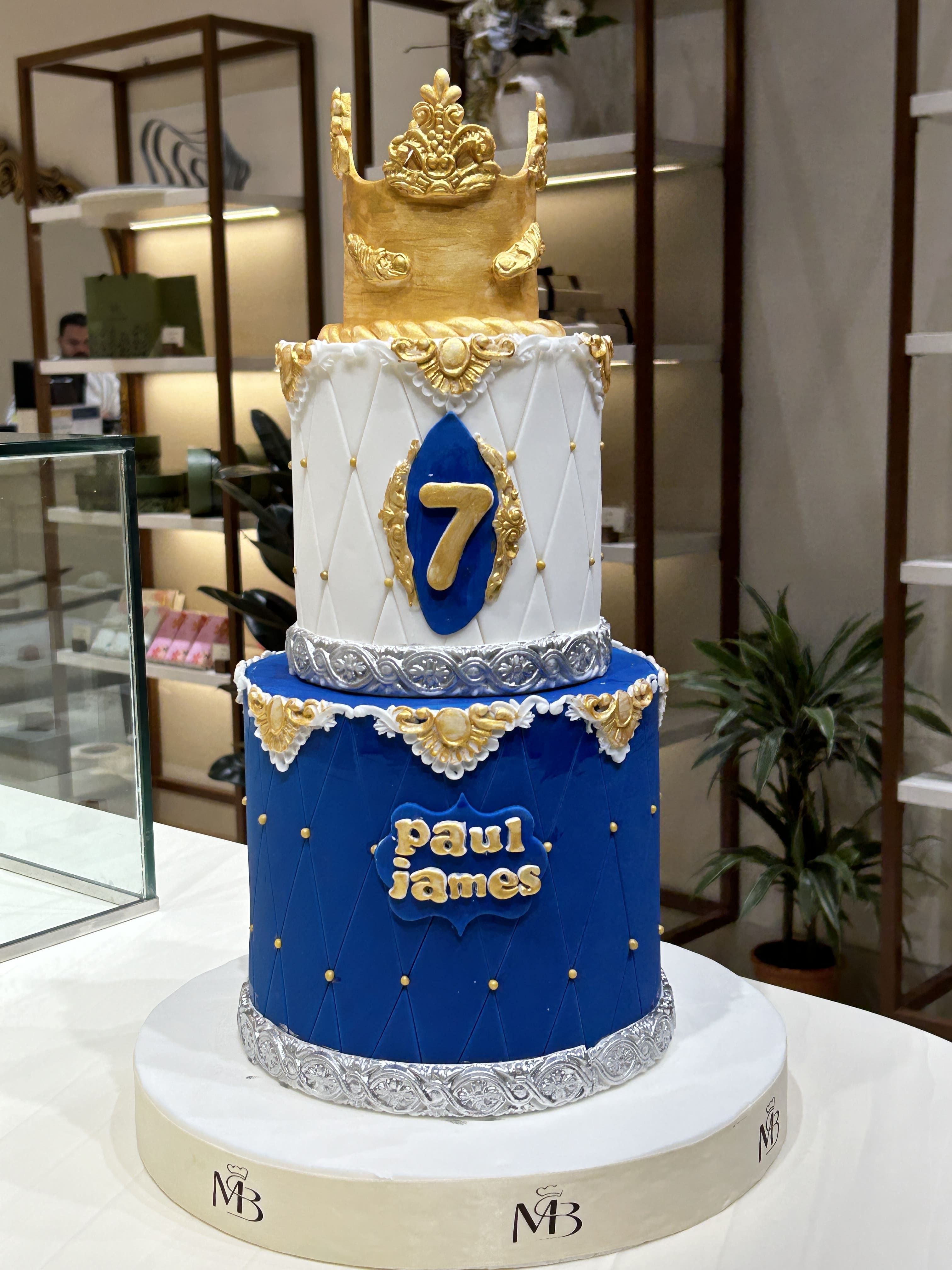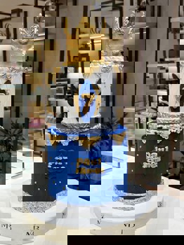 ترجمها: كيكة ملكية بتصميم فاخر من طبقتين، تجمع بين اللون الأزرق الملكي والأبيض الماسي، مزينة بتفاصيل ذهبية وفضية أنيقة، ويتوجها تاج ذهبي فاخر. مثالية لأعياد الميلاد أو المناسبات ذات الطابع الملكي