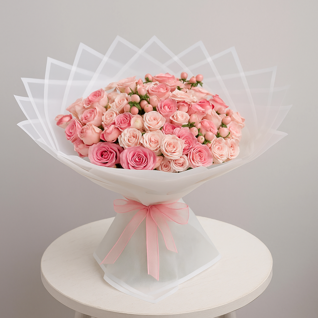 باقة ناعمة من الورد الوردي والكريمي مع لمسات من التوت الصغير، مغلّفة بورق شفاف ومربوطة بشريط وردي أنيق