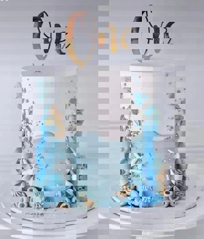 كيكة ميلاد بتصميم بحري ، تجمع بين الأبيض والأزرق ، مزينة بنجوم البحر، فرس البحر، وأصداف من الحلوى، مع لمسات ذهبية براقة و topper يحمل كلمة