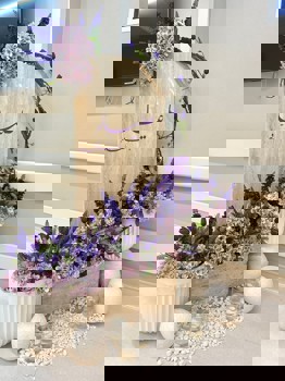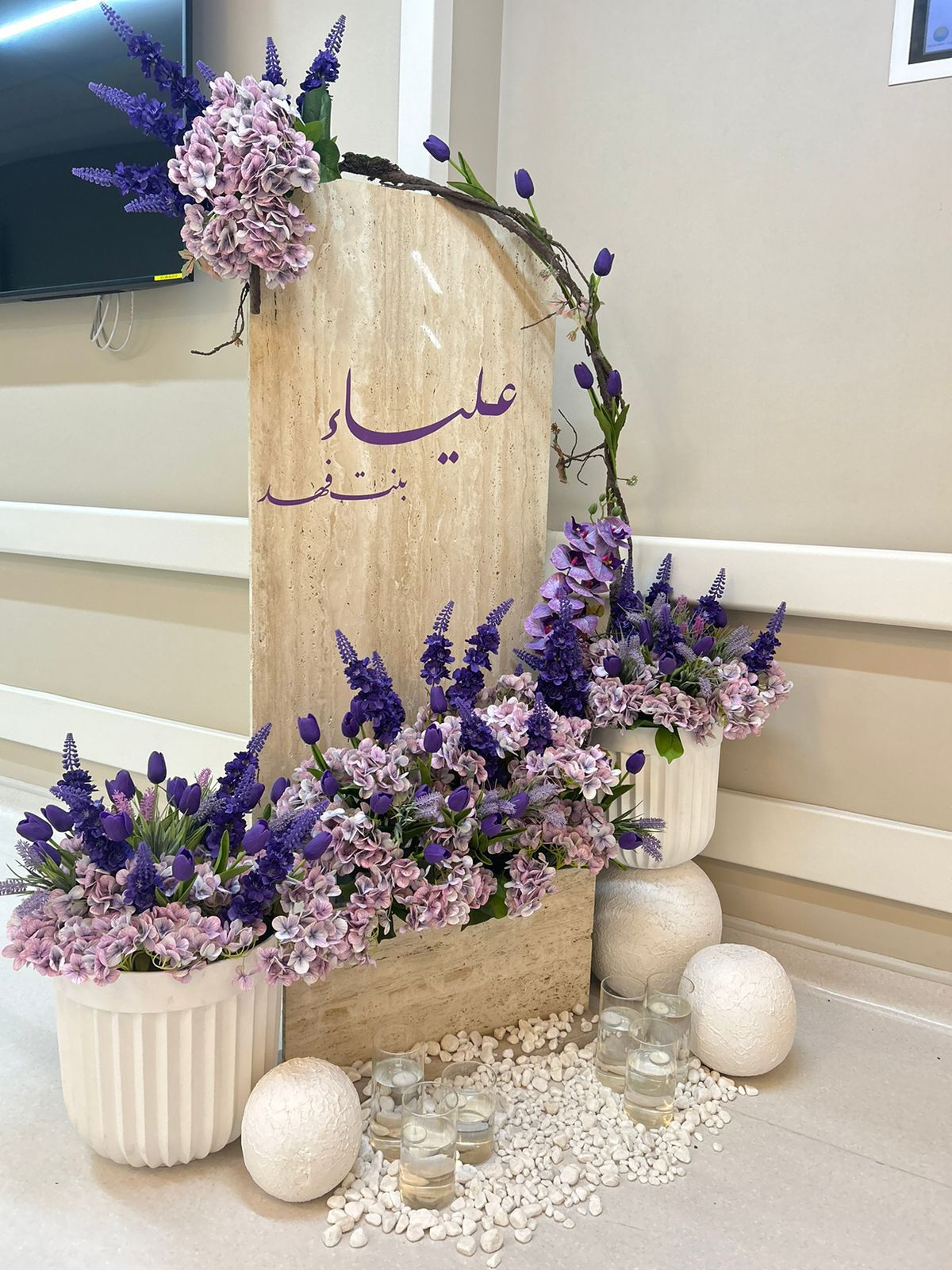 تنسيق فاخر يجمع بين رقي اللون البنفسجي وهدوء الوردي الفاتح مصمم على لوح رخامي أنيق يحمل الاسم بخط عربي جميل. تحيط به ورود الليلك والخزامى مع لمسات من التوليب البنفسجي، تعانقها أغصان متسلقة لإضفاء لمسة طبيعية ساحرة. تتناثر الحصى البيضاء وكريات ديكورية مع شموع زجاجية صغيرة، لتكمل أجواء الدفء والفخامة. مناسب للاستقبالات، المناسبات الخاصة، وحفلات الترحيب ليترك بصمة أنيقة في الذاكرة.