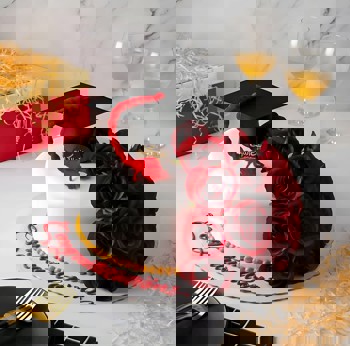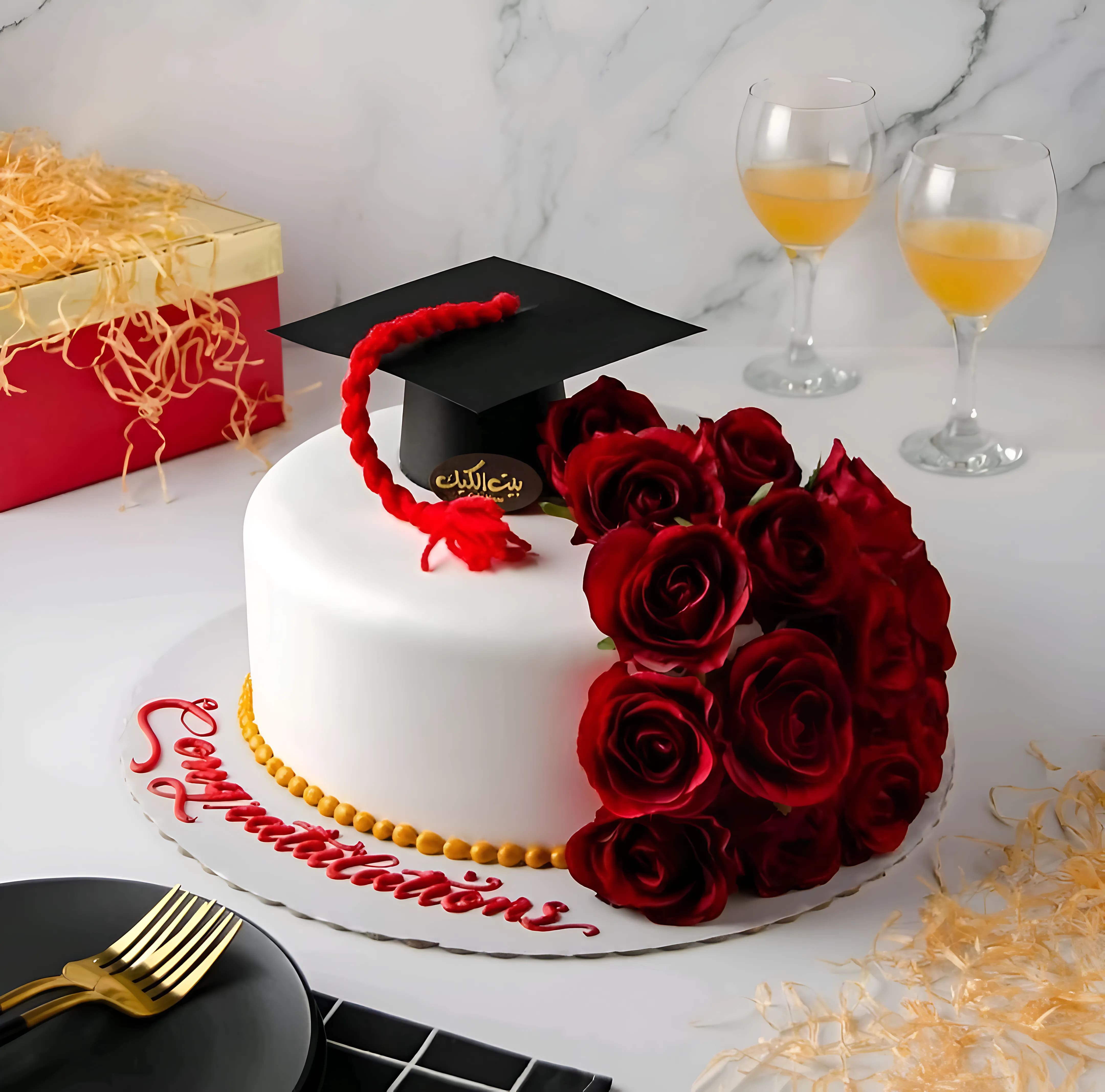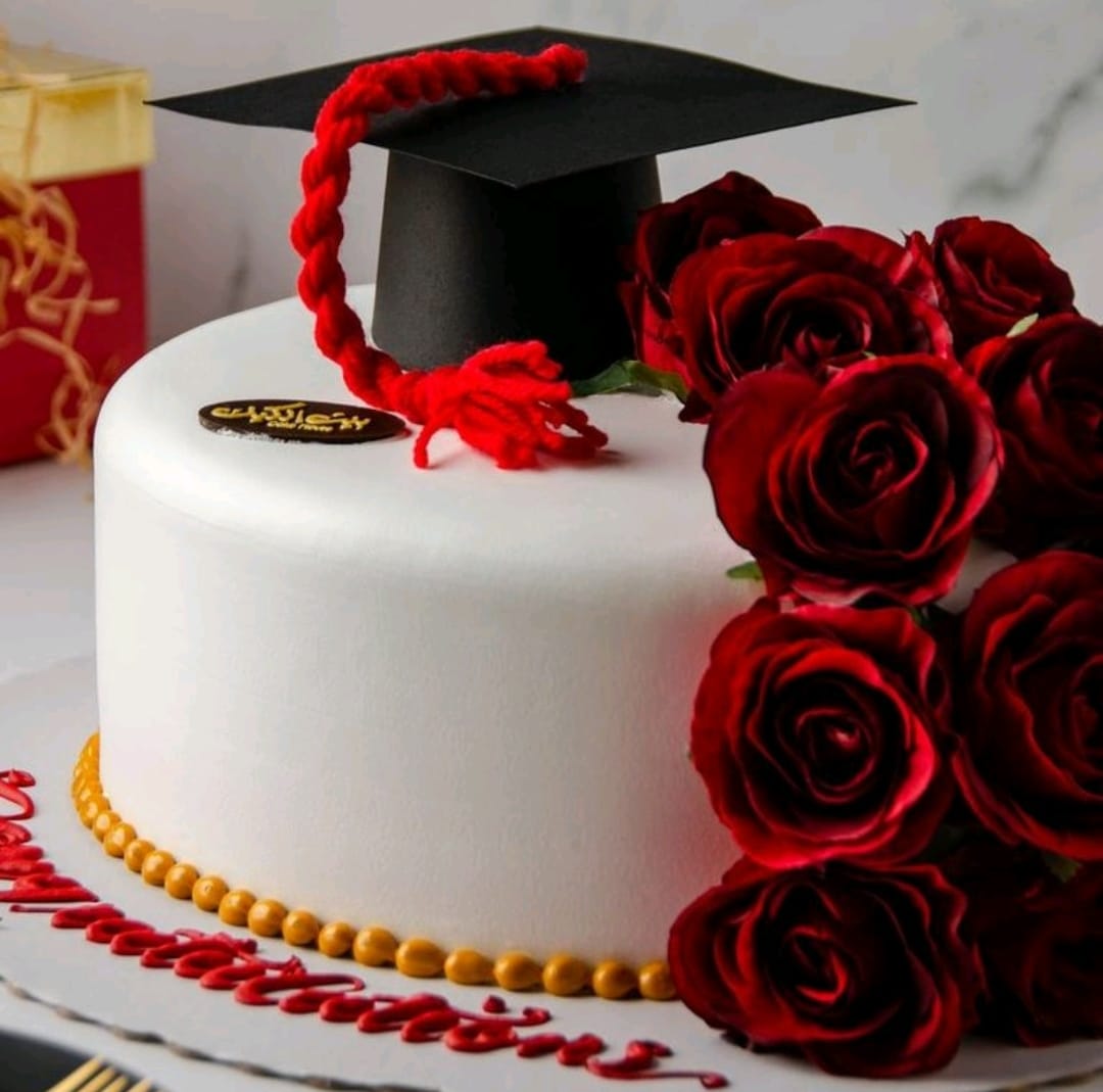 كيكة بيضاء بسيطة تزينها قبعة تخرج سوداء وشريط أحمر، مع باقة من الورود الحمراء الفاخرة تنساب من الأعلى إلى القاعدة. محاطة بلمسة ذهبية عند القاعدة وعبارة "مبروك" مكتوبة بالأحمر تكفي لعدد ٢٠ شخص