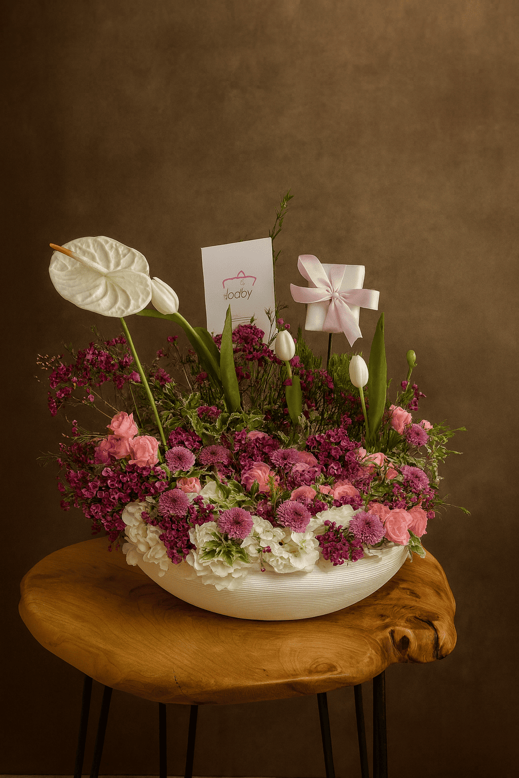 تنسيق زهور غني بدرجات الوردي والأبيض والبنفسجي داخل قاعدة سيراميكية