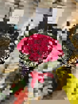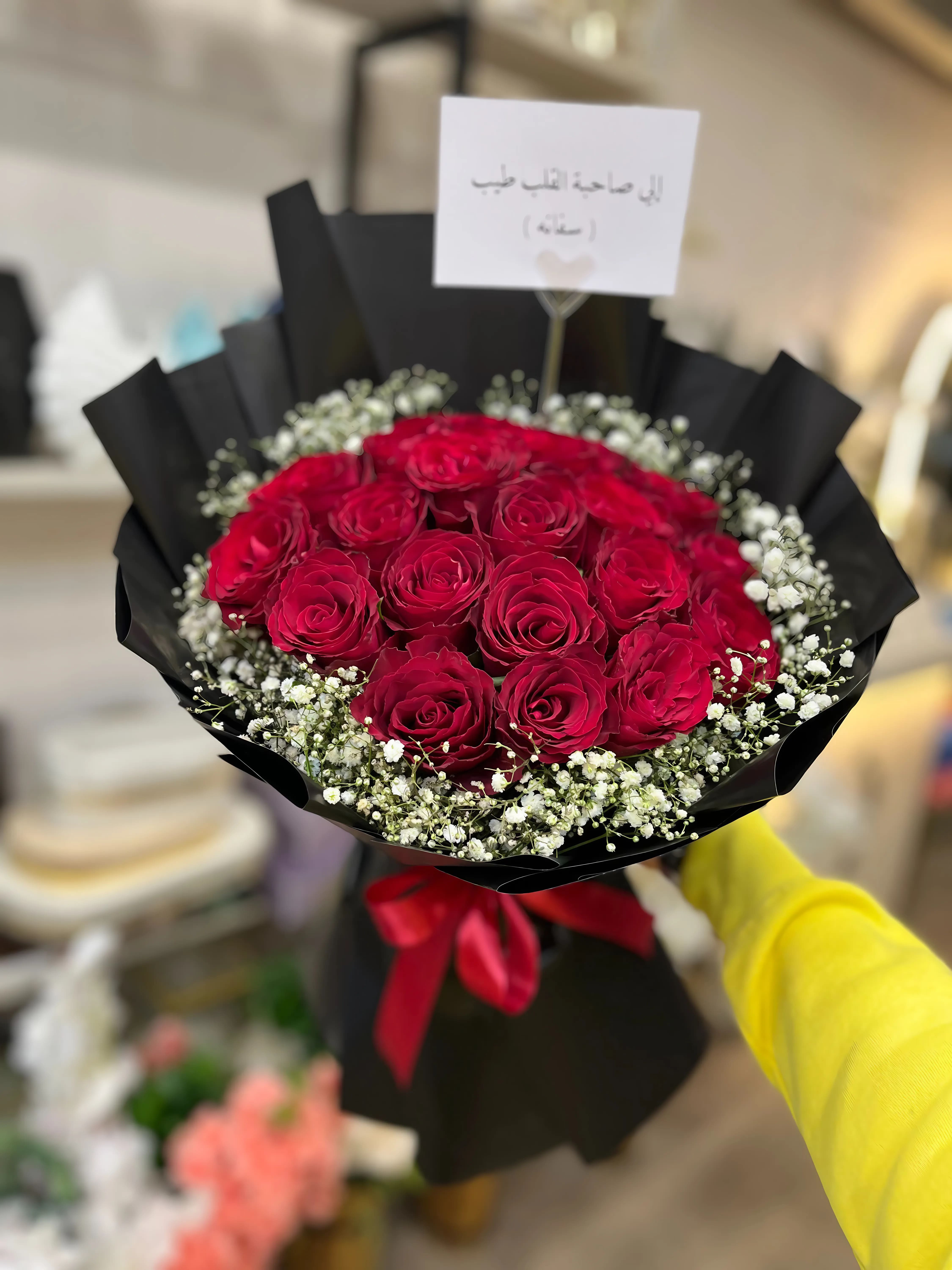 باقة رومانسية من الورد الأحمر الغامق مغلّفة بالأسود، مزينة بزهور الجيبسوفيلا البيضاء وشريط أحمر أنيق