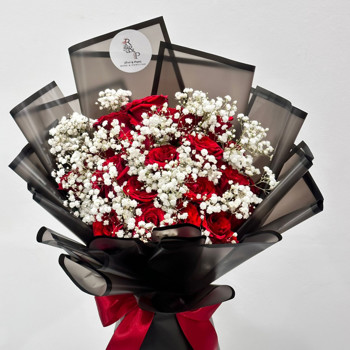 باقة من الورود الحمراء المتألقة محاطة بزهور الجيبسوفيليا البيضاء الناعمة، ملفوفة بتغليف أسود أنيق ومزينة بشريط ساتان أحمر.