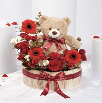 هدية رومانسية رائعة تضم دبدوبًا ناعمًا وسط الورود الحمراء النابضة بالحياة مع لمسات ذهبية أنيقة. مثالية لجعل شخص ما يشعر بالتميّز والسعادة.