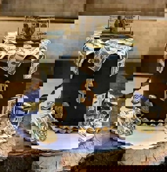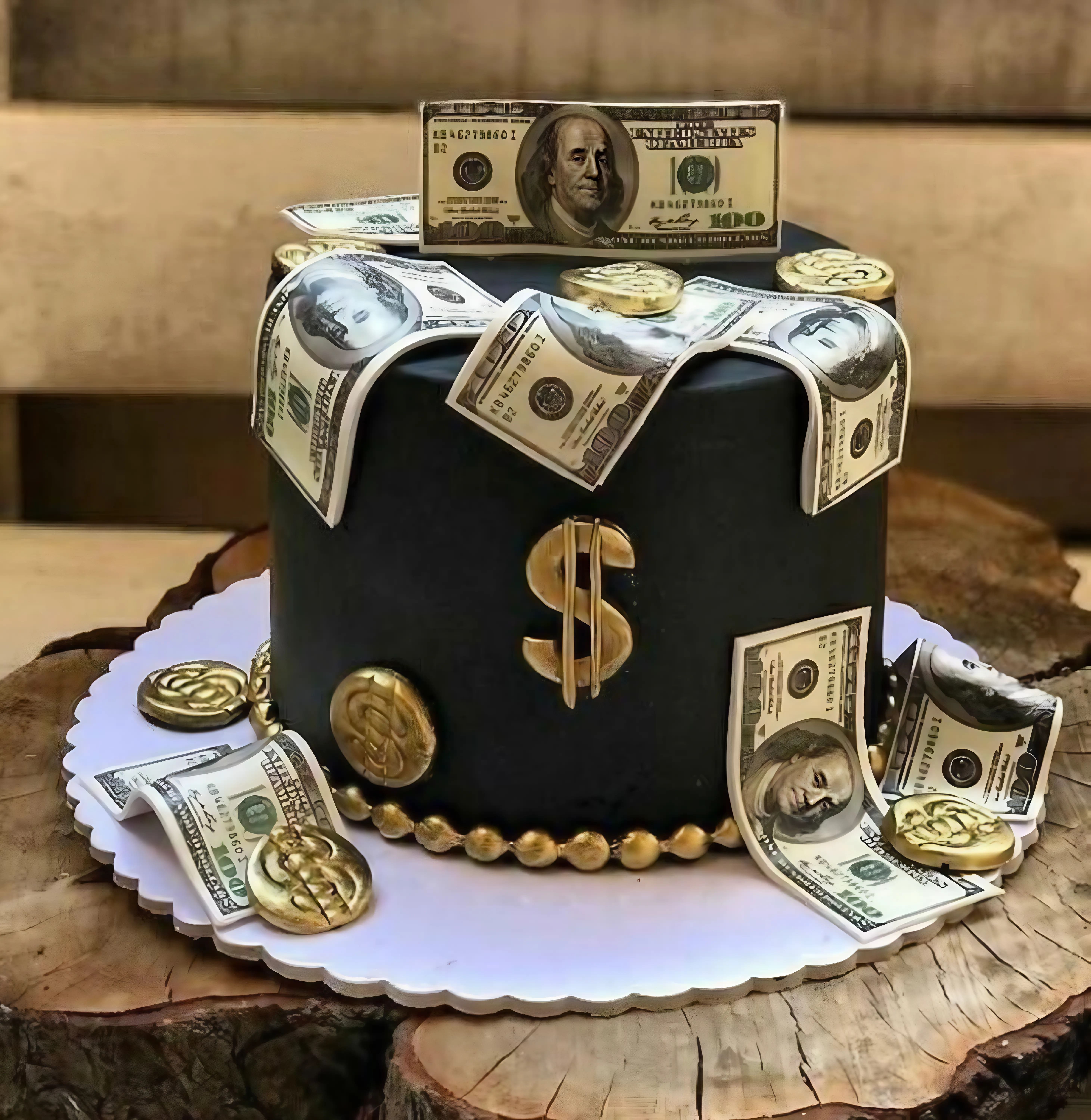كيكة فاخرة بتصميم أنيق باللون الأسود الملكي، مزينة بأوراق نقدية من فئة 100 دولار (بطباعة صالحة للأكل) وعملات ذهبية لامعة ورمز الدولار بشكل بارز. مثالية لاحتفال فاخر