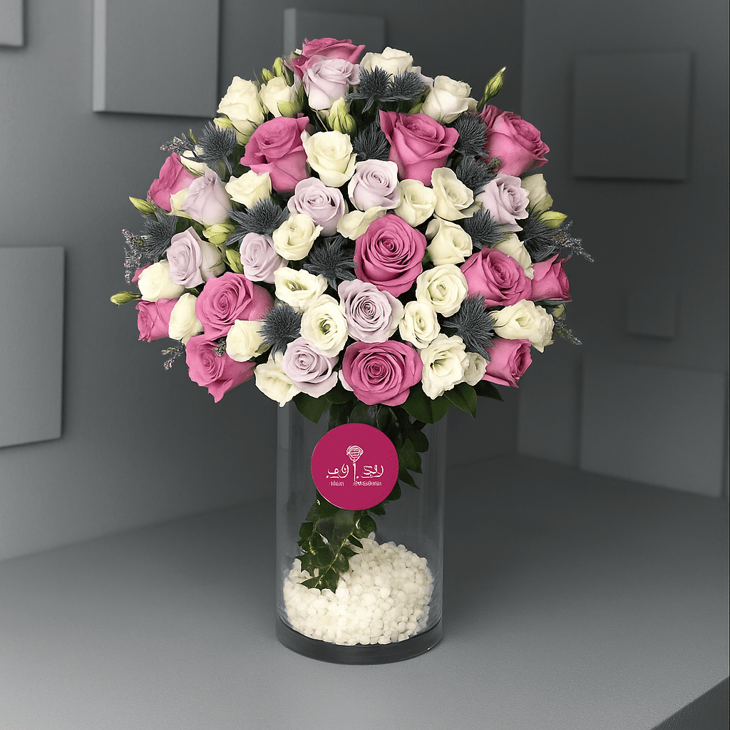 فازة ورد مميزة تحتوي على ورد بألوان مختلفة، تناسب كل المناسبات وتزين أي ركن بذوق راقٍ