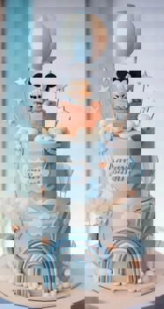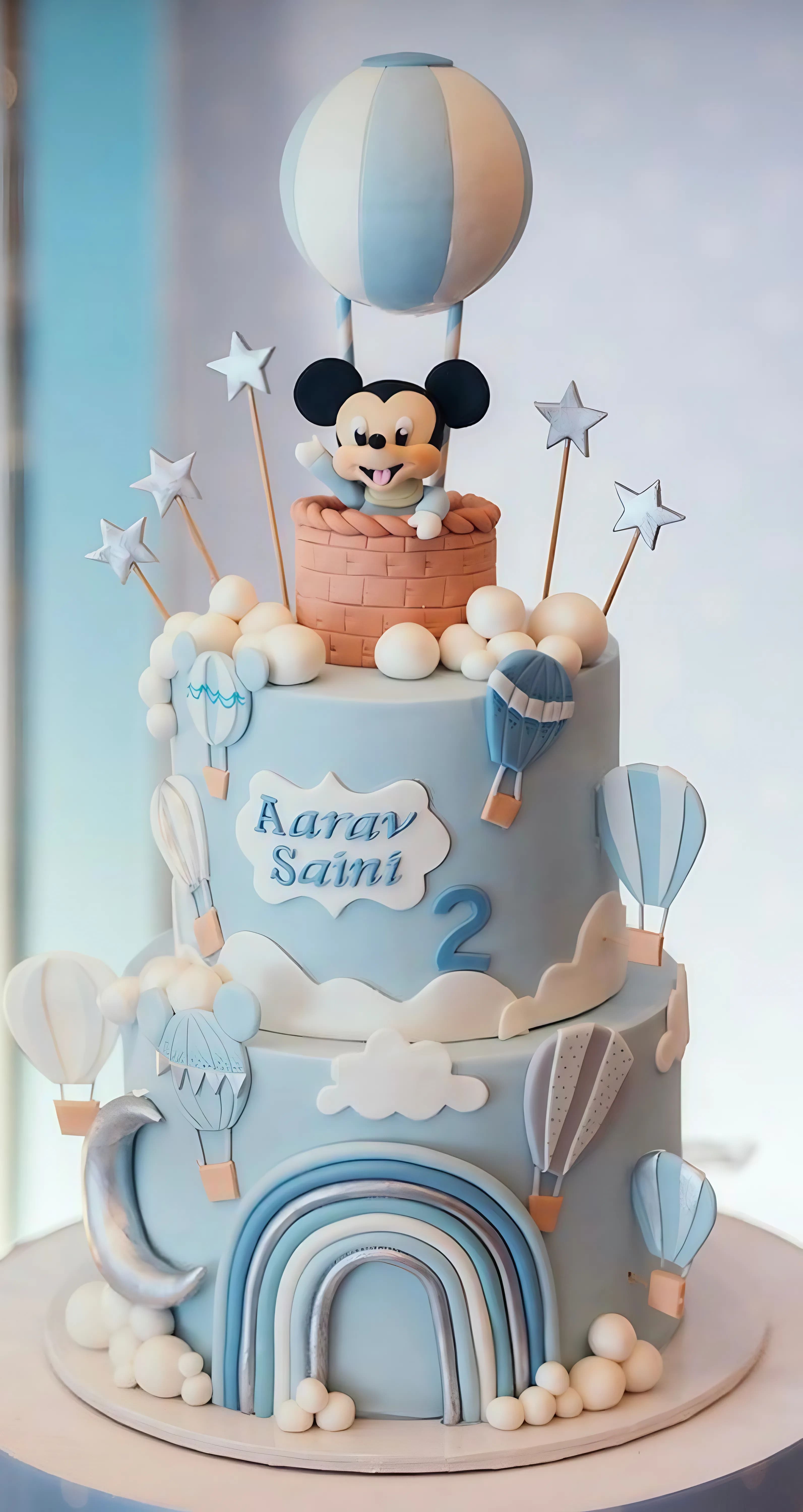 كيكة ، مزينة بسحب وألوان سماوية هادئة، و ميكي ماوس صغير في منطاد. تحمل اسم الطفل ورقم