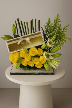 بكج ورود طبيعية ذات ألوان هادئة مع شوكليت بستاني ، مثالية كهدية للتهنئة والمناسابات يتوفر كتابة كرت باللغة العربية والإنجليزية، الرجاء كتابة المطلوب طباعته في الملاحظات