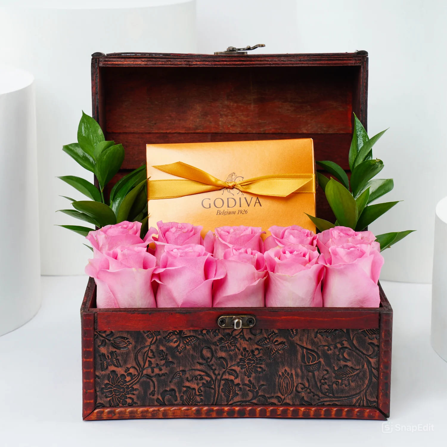 - صندوق خشبي (متوسط) - 10 ورود زهرية - بوكس شوكولاته جوديفا (6 قطع)"