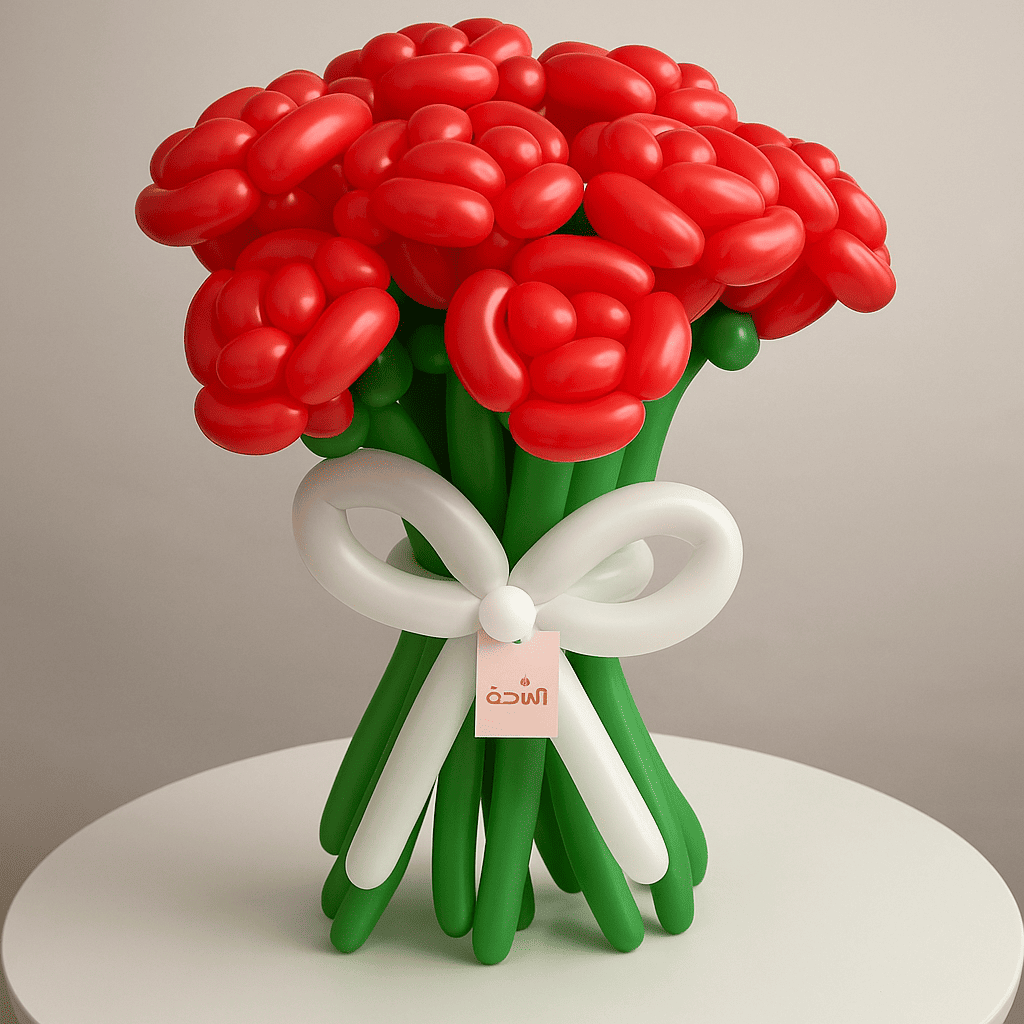 بوكية من الورد يحتوي علي اثني عشر بالون باللون الأحمر الزاهي