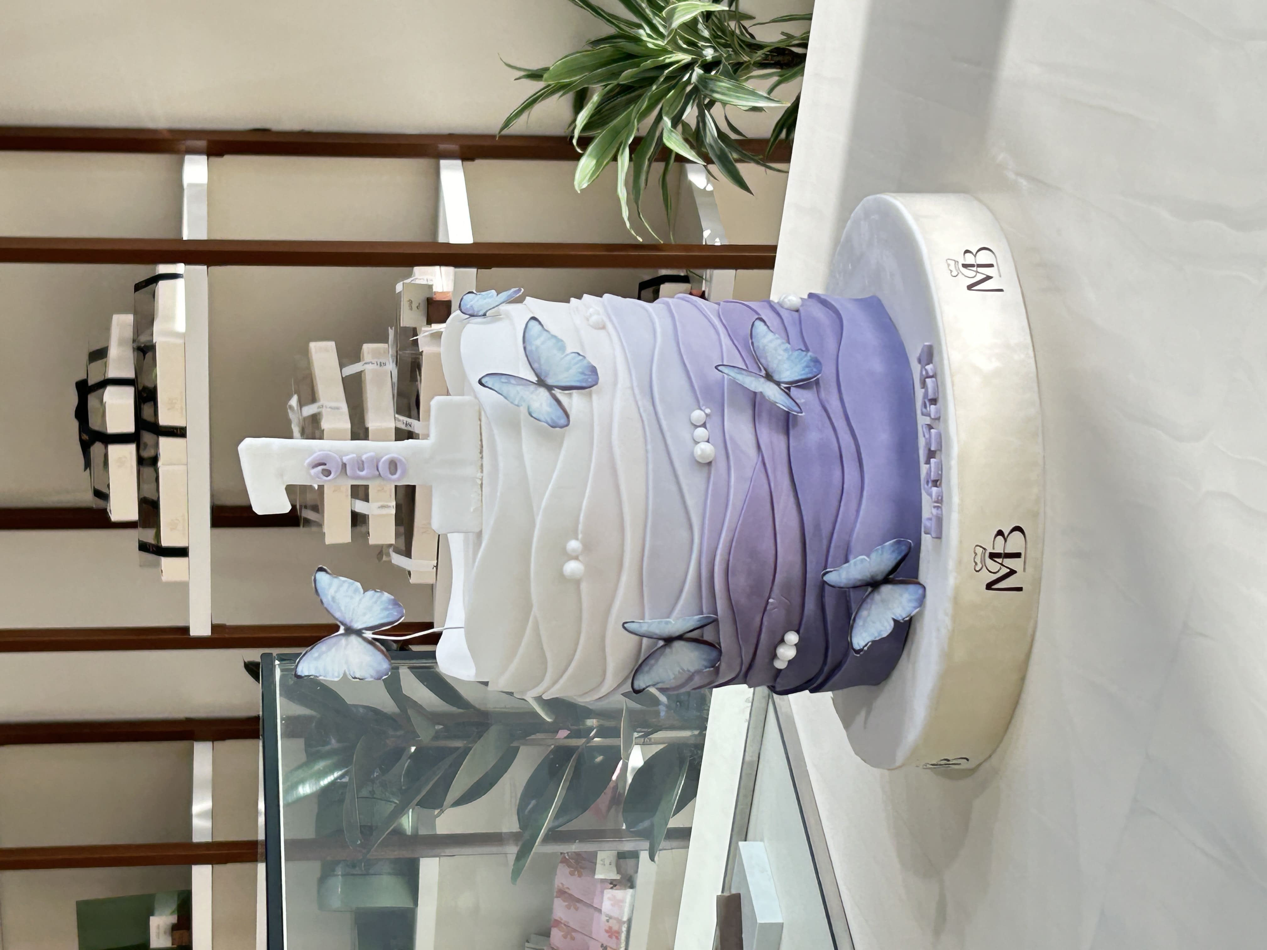 كيكة عيد ميلاد ساحرة لاحتفال بعامٍ أول، بتدرجات ألوان الأبيض والبنفسجي، مزينة بفراشات رقيقة وخرز لؤلؤي * تكفي لعدد ١٥ شخص * الحشوة فانيلا وتوت ازرق