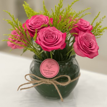 فازة زجاجية تحتوي علي زهور الجوري الناعمة باللون الوردي