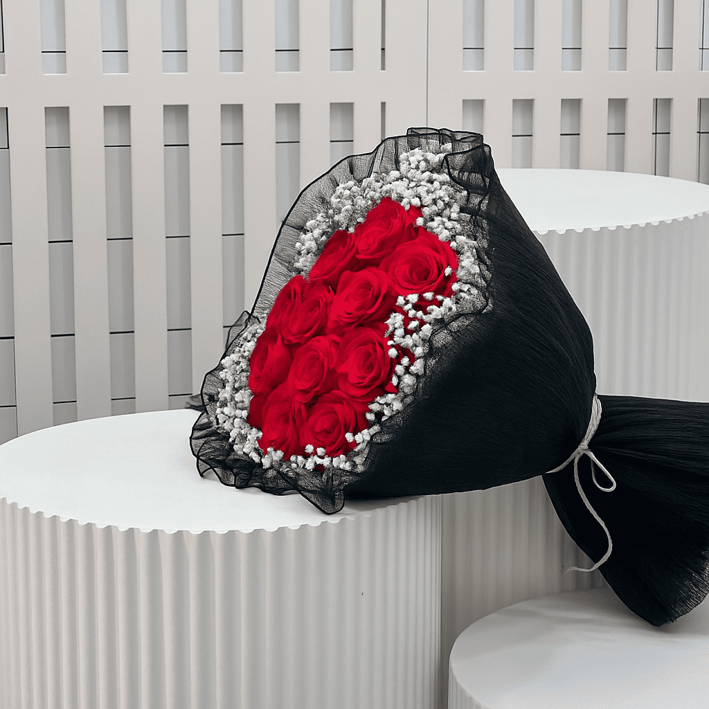 بوكيه مكون من ورد الجوري الأحمر، مغلف بورق أسود أنيق ومزين بشريطة ساتان أبيض.