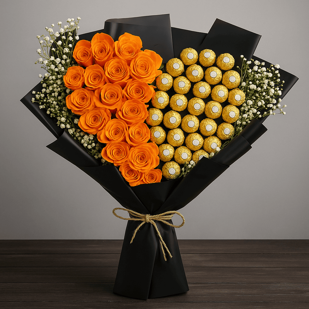 باقة مميزة بتنسيق قلب، تجمع بين ورود برتقالية زاهية وشوكولاتة ذهبية، مغلّفة بورق أسود أنيق مع لمسة من الورد الأبيض الصغير.