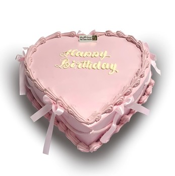 كيكة على شكل قلب بلون وردي هادئ وتزيين بشرائط ناعمة، مثالية لعيد ميلاد أنثوي ورومانسي
