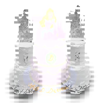 كيكة من طبقتين باللون الوردي الفاتح، بتصميم أنيق مستوحى من الأميرة النائمة مزينة بتاج وقصر الأميرات، وحرف ذهبي في المنتصف، مع عبارة “Happy Birthday” مكتوبة على القاعدة تكفي لعدد ٣٥ شخص