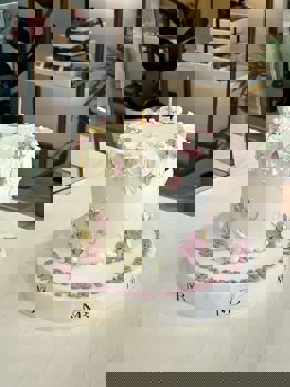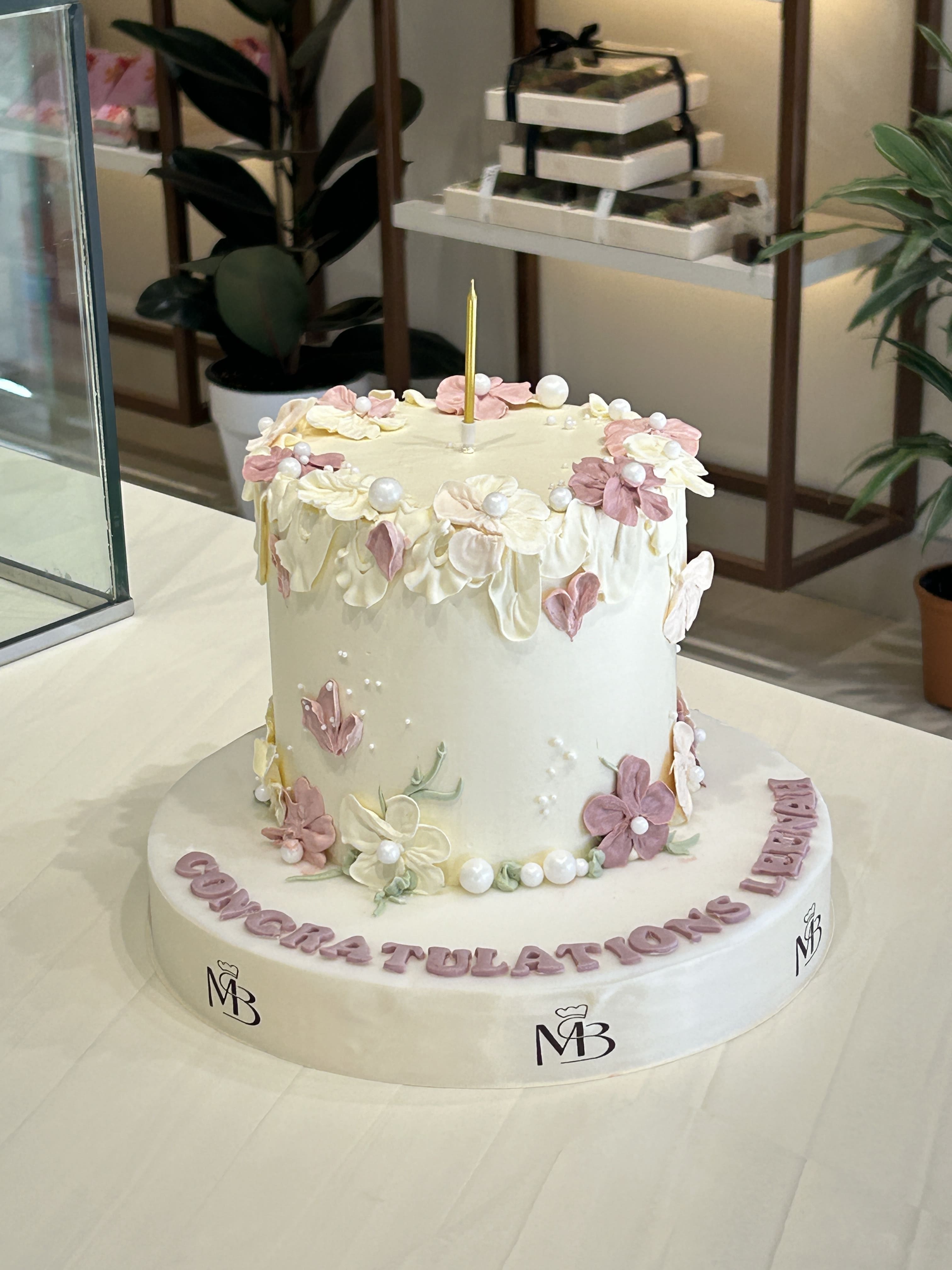 كيكة جميلة بطبقة واحدة، لونها أبيض كريمي ومزينة بزهور وردية وبيضاء، مع حبات لؤلؤ سكرية. مكتوب عليها "Congratulations"، مناسبة لحفلات التخرج أو أي مناسبة خاصة.