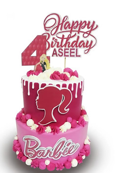 كيكة باربي مكونة من طبقتين بدرجات اللون الوردي، مزينة بالكريمة والشعار وتوبّر مخصص ليوم ميلاد