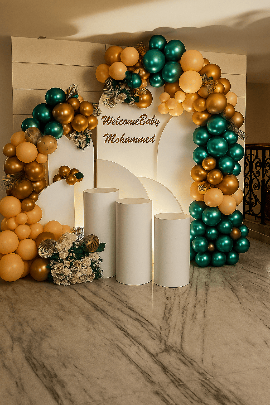 خلفيتين، قوس بالون مع ورد، طاولة كيك