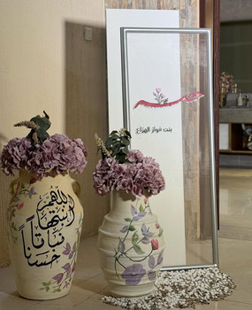 - ستاند مع طباعة مخصصة - فازتين ورد مع كتابة مخصصة - تزيين بالحجر
