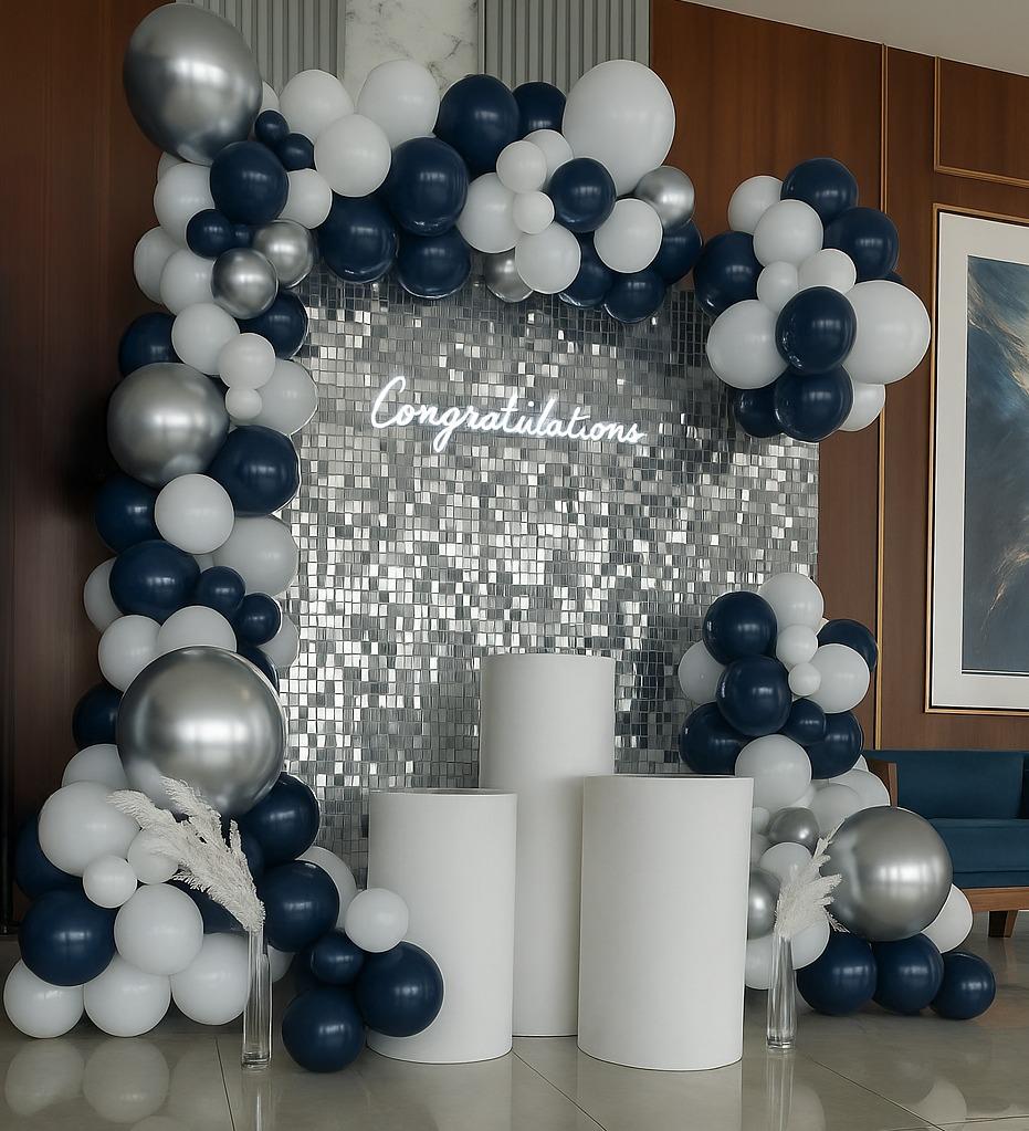 خلفية جليتر، قوس بالون، ستاند بالون، طاولة كيك، عبارة مضيئة