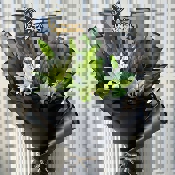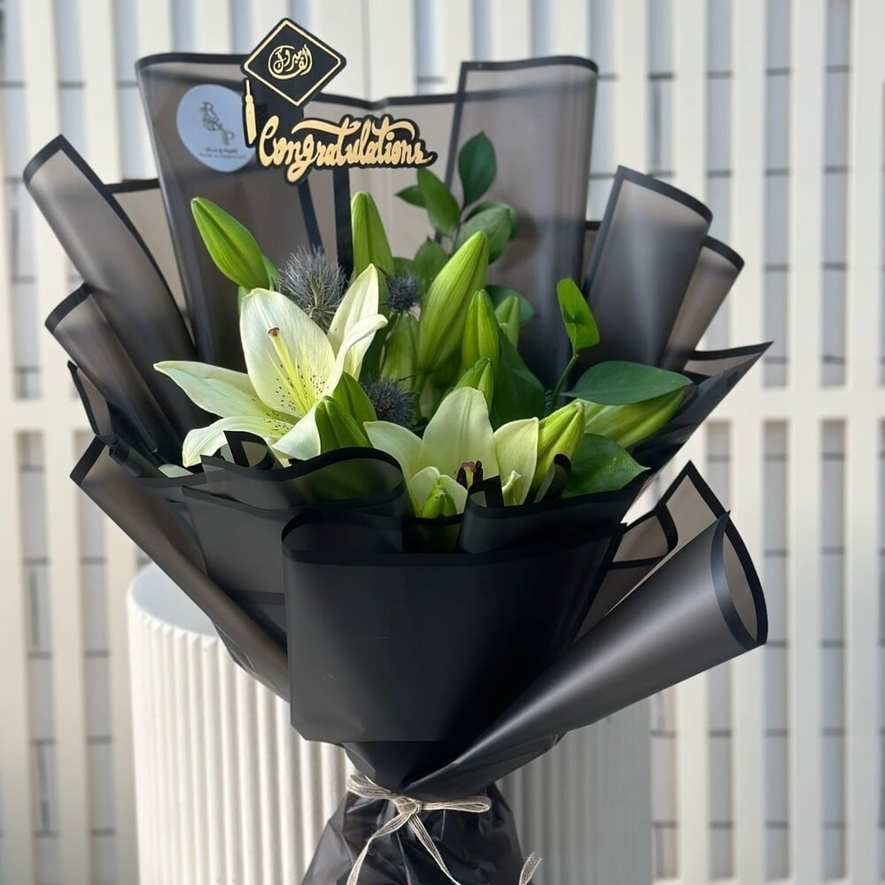 بوكيه من زنابق بيضاء متفتحة مع براعم خضراء ولمسات من الأوراق الطبيعية، ملفوفة بتغليف أسود .