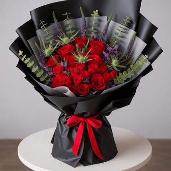 باقة ورد جوري الأحمر المميز مُزين بالنباتات الخضراء