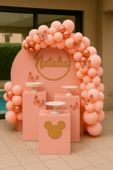 خلفية دائرية، قوس بالون، فراشات تزيين، طاولة كيك