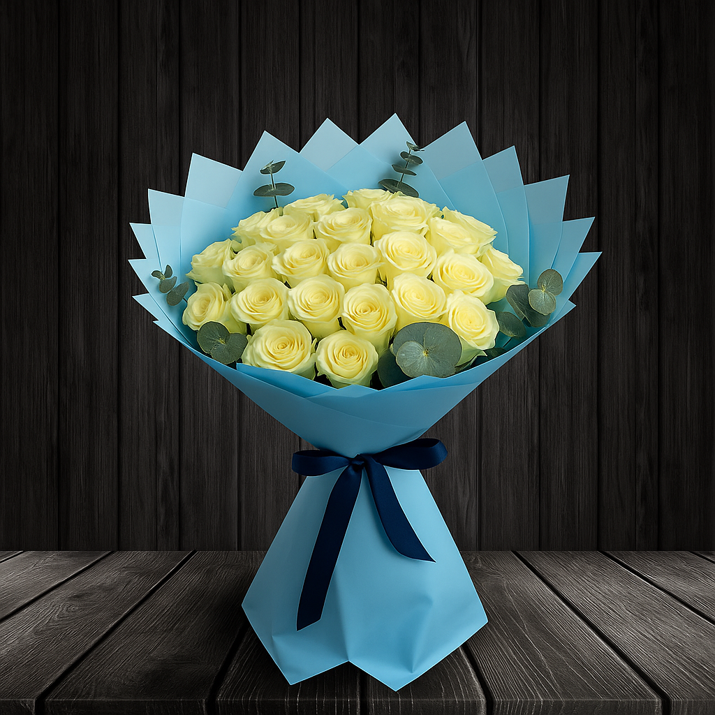باقة ناعمة من الورد الأصفر الفاتح مغلّفة بورق أزرق سماوي، ومربوطة بشريط كحلي مع لمسات من أوراق اليوكالبتوس.