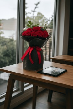باقة ساحرة من الورود الحمراء ملفوفة بقماش شبكي أنيق ومربوطة بشريط أحمر فاخر، تجسد الأناقة والرومانسية الخالدة.