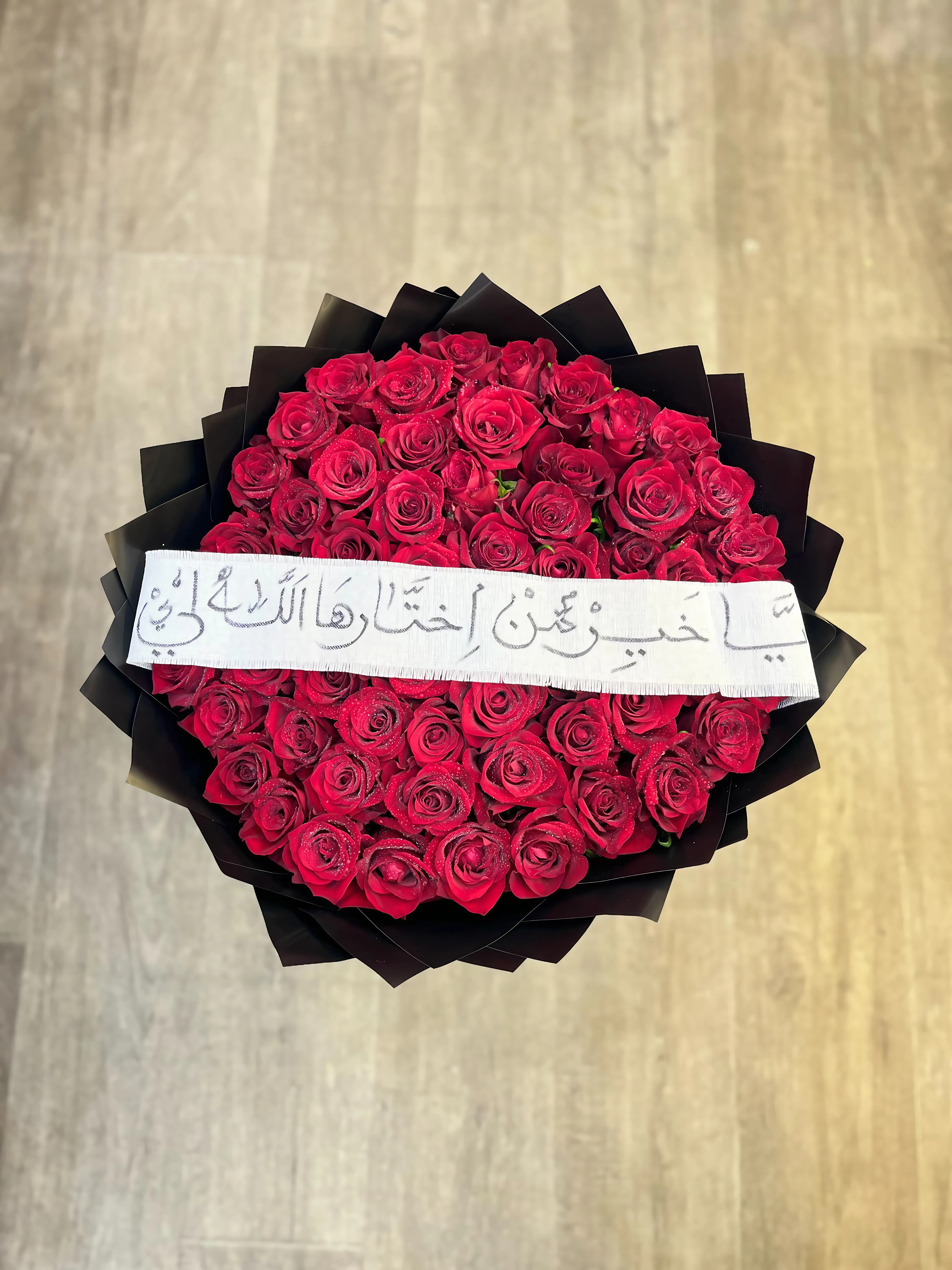 باقة مفعمة بالشغف من الورد الأحمر مغلّفة بورق أسود، مزينة بشريط يحمل رسالة عربية تعبّر عن مشاعر صادقة وعميقة