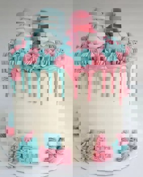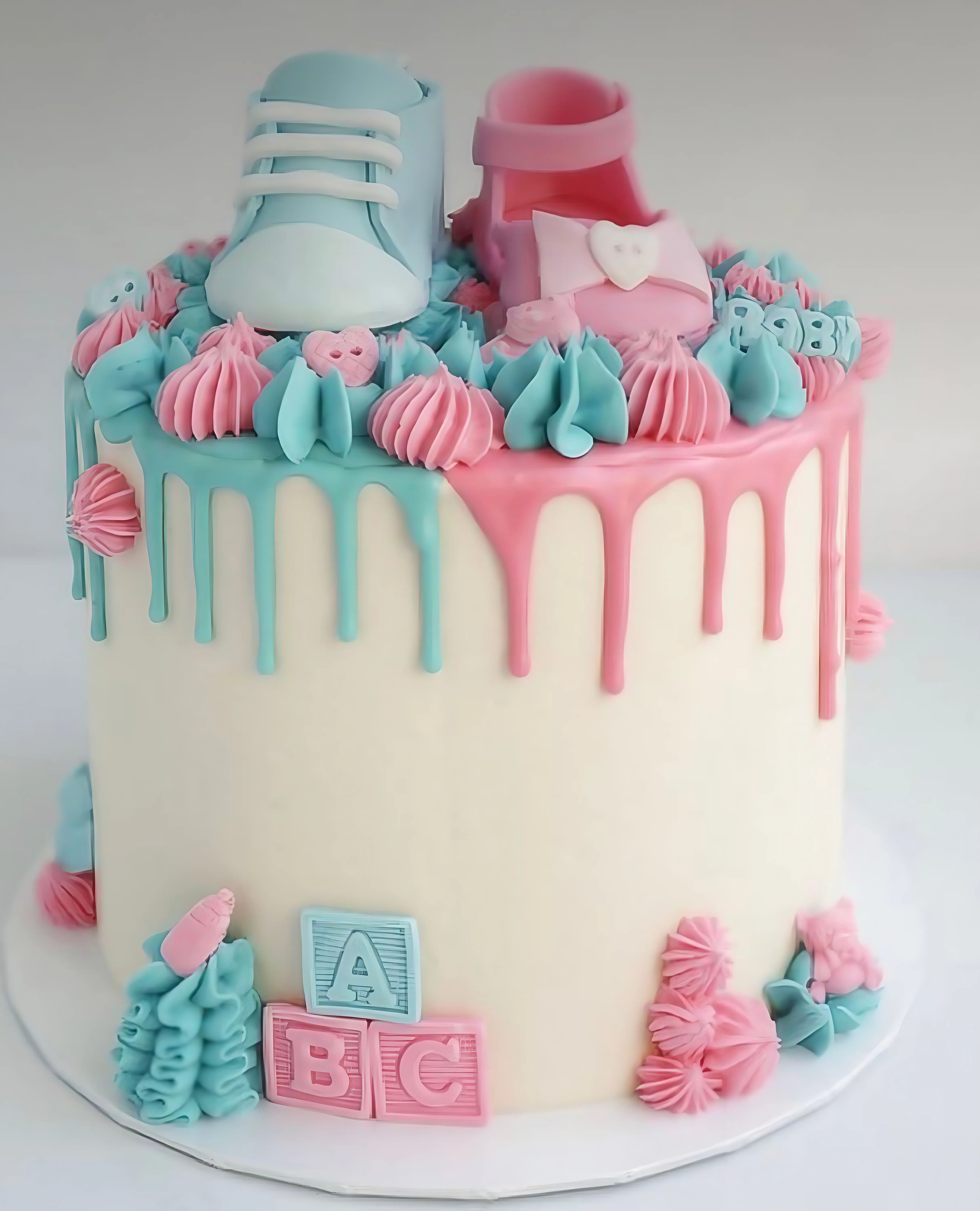 كيكة مميزة لحفلة الكشف عن جنس المولود، مزينة بألوان الباستيل الوردي والأزرق مع قطرات كريمية ناعمة. يعلوها حذاءان صغيران، أحدهما للبنات والآخر للأولاد، مع لمسات لطيفة من مكعبات الحروف وزينة البيبي.